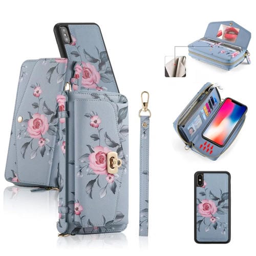 Funda de Cuero Pola Flower para iPhone X Xs con Billetera Cruzada Multifuncional y Cremallera (Azul)