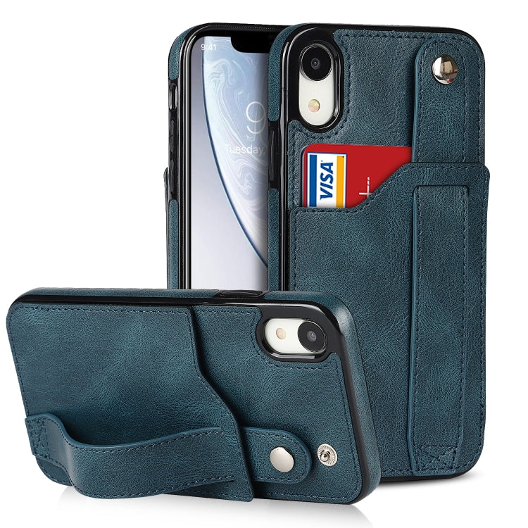 Funda para iPhone Xr Crazy Horse Texture Cuero TPU + PU a Prueba de Golpes con Ranura para Tarjeta y Correa para la Muñeca (Azul Zafiro)
