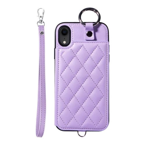 Estuche para teléfono iPhone Xr con bolsa para tarjetas textura rómbica y cordón corto (Púrpura)