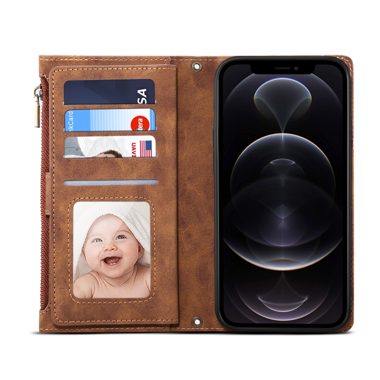 Funda de Cuero para iPhone Xr con Tapa Horizontal Esmerilada Retro Soporte Ranura Tarjeta Billetera Bolsillo Cremallera Cordón (Marrón)