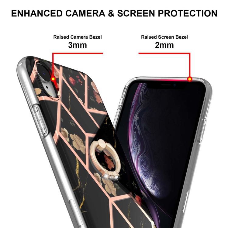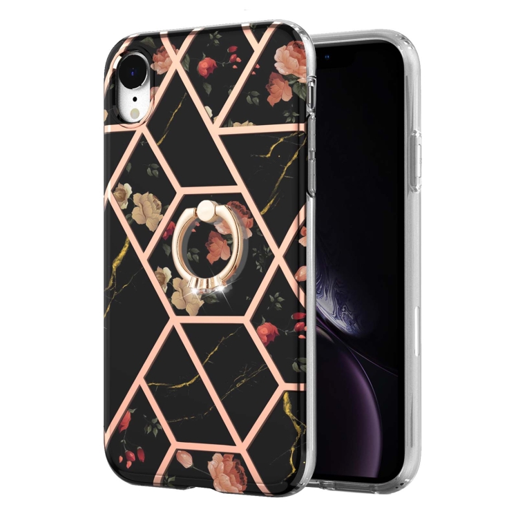 Estuche TPU para iPhone Xr Galvanoplastia Empalme Patrón Flor Mármol Soporte Anillo (Flor Negra)
