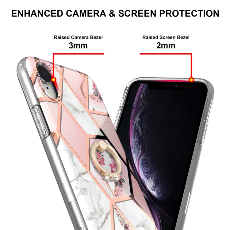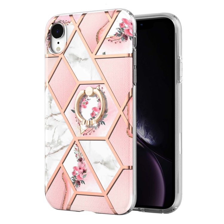 Estuche TPU para iPhone Xr Galvanoplastia Patrón de Flores Mármol Soporte Anillo (Flor Rosa)