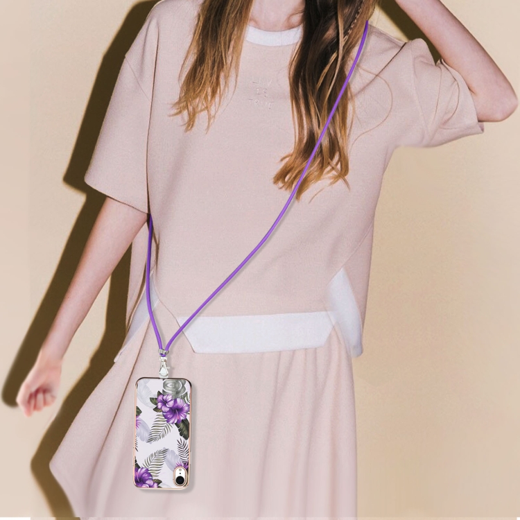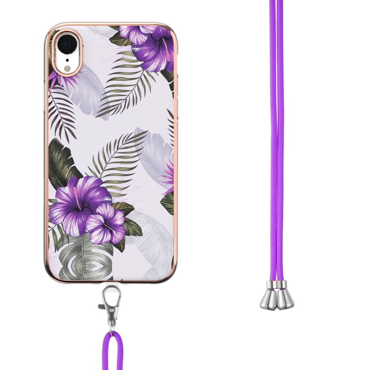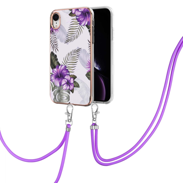 Estuche TPU para iPhone Xr Galvanoplastia Patrón Imd a Prueba de Golpes con Cordón para El Cuello (Flor Púrpura)