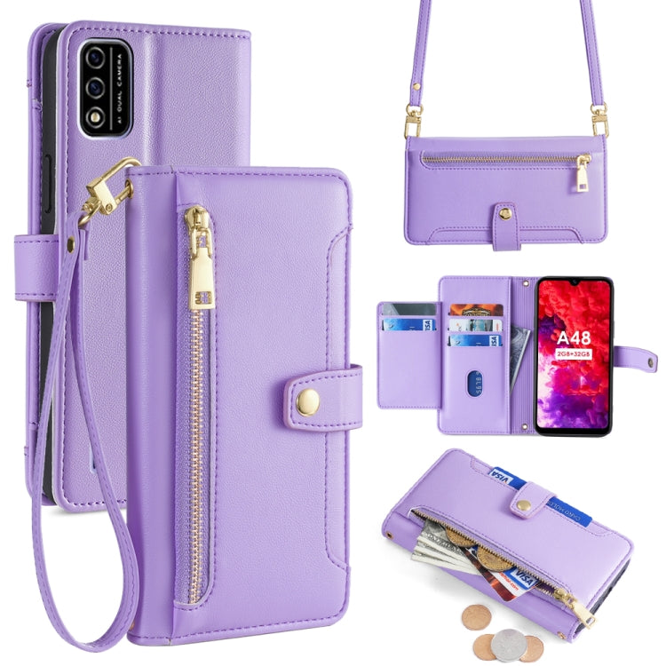 Estuche de Cuero para Itel A48 con Billetera, Cremallera y Cuerpo Cruzado (Púrpura)