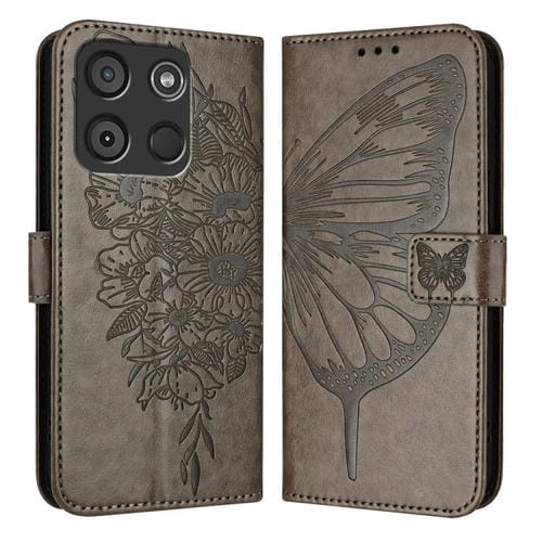 Funda de Cuero para Itel A60 y A60S con Mariposa en Relieve (Gris)