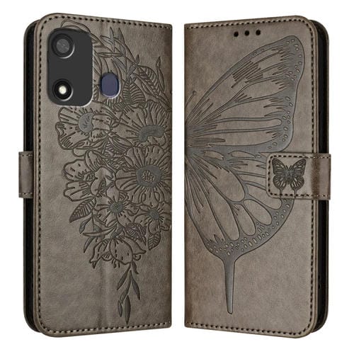 Funda de Cuero para Itel P17 / A27 con Mariposa en Relieve (Gris)
