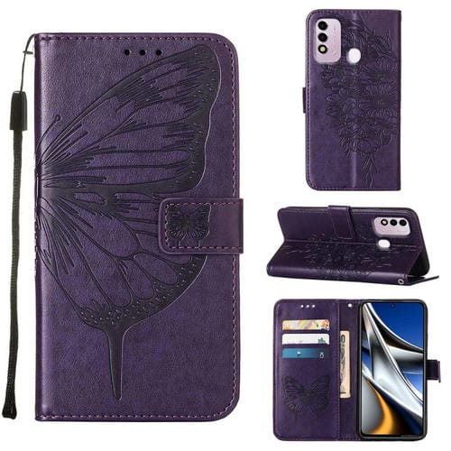 Funda para Itel P37 Vision 2S de Cuero con Mariposa en Relieve (Morado Oscuro)