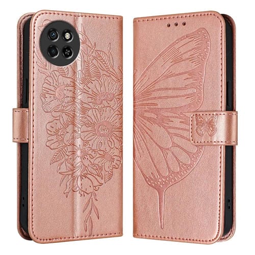 Funda de Cuero para Itel S23 con Mariposa en Relieve (Oro Rosa)