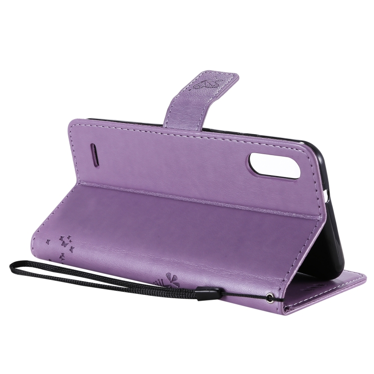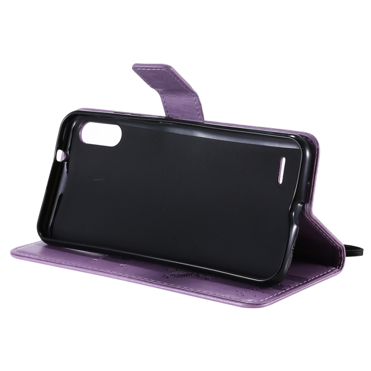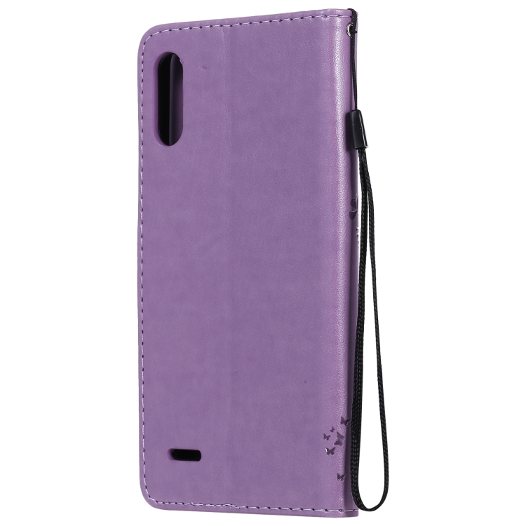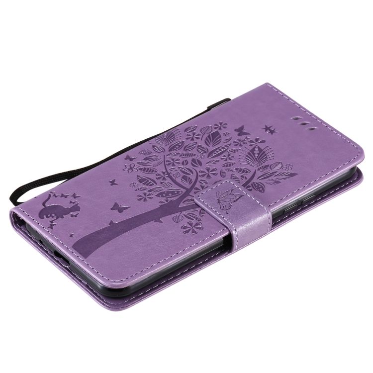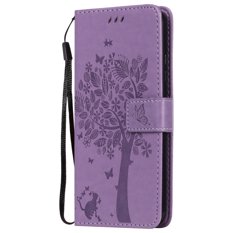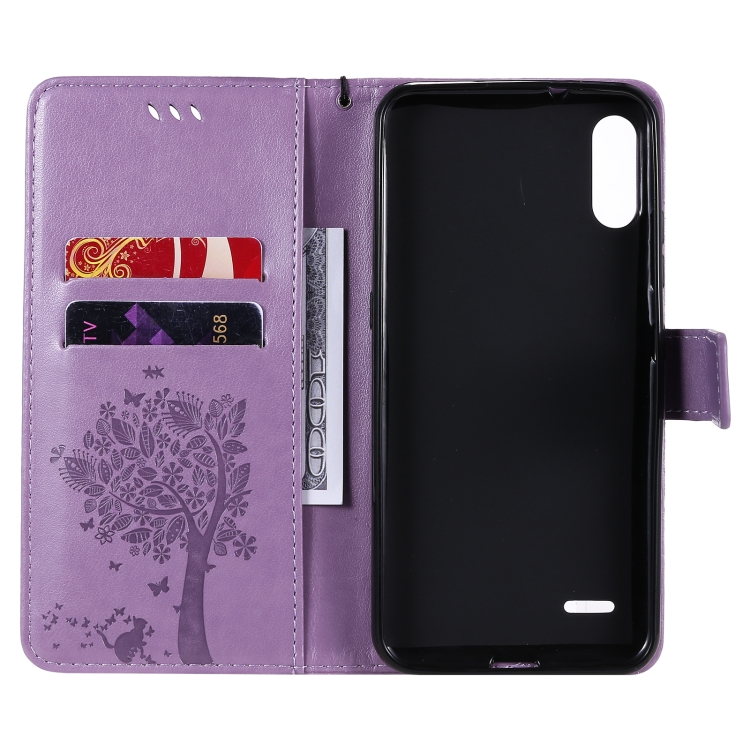 Funda Cuero PU LG K22 K22 Plus con Patrón Árbol y Gato, Tapa Horizontal, Soporte, Ranuras y Cordón (Morado Claro)