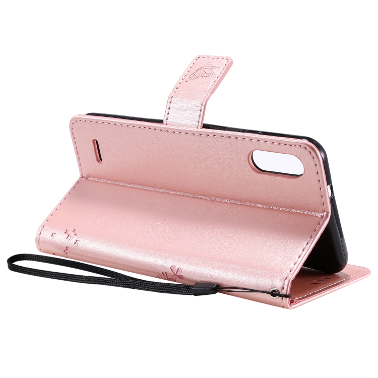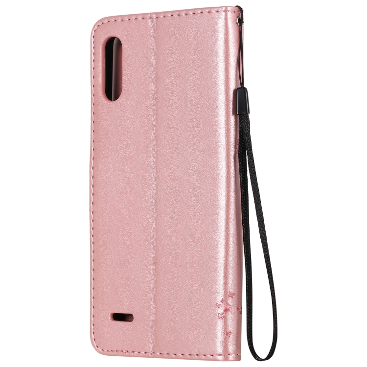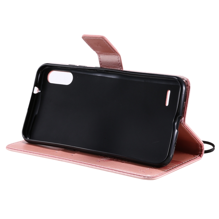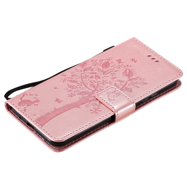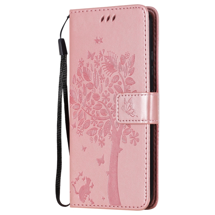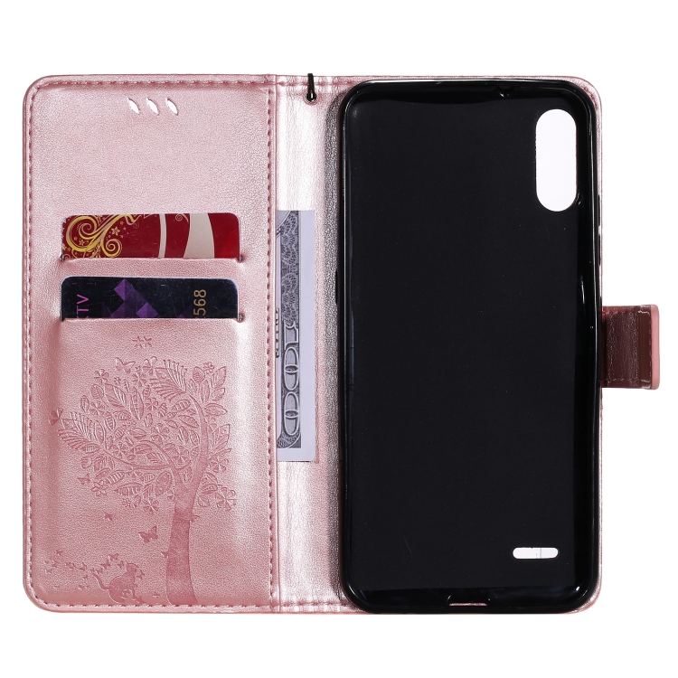 Funda Cuero PU LG K22 K22 Plus Patrón Árbol y Gato Tapa Horizontal Soporte Ranuras Tarjetas Billetera Cordón (Oro Rosa)
