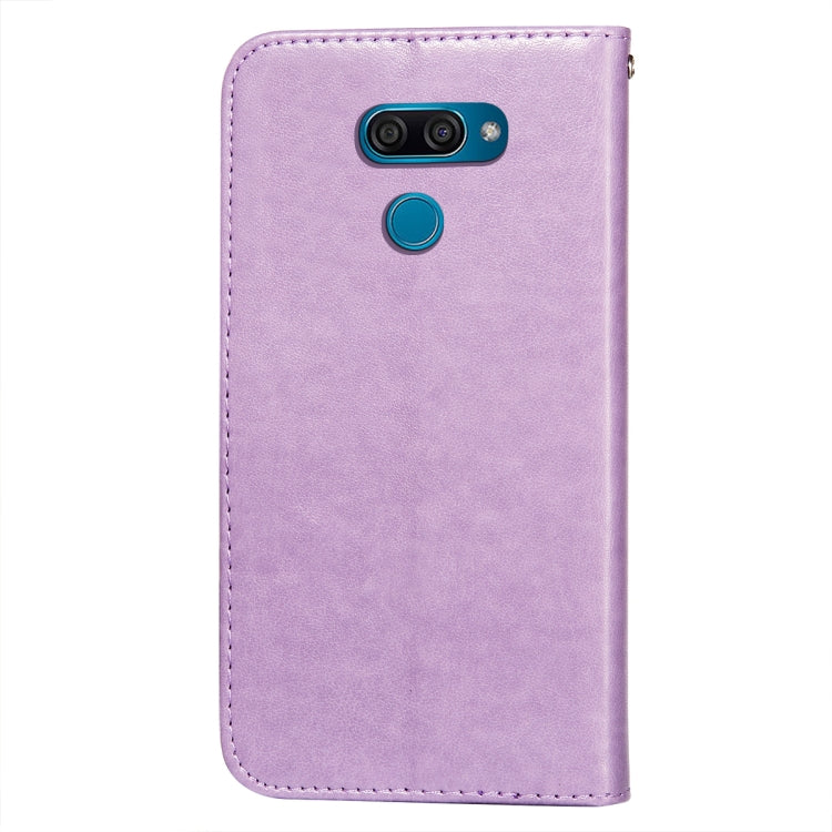 Estuche de Cuero Abatible Horizontal para LG K50 con Patrón En Relieve, Ranura para Tarjeta, Soporte y Cordón (Púrpura)