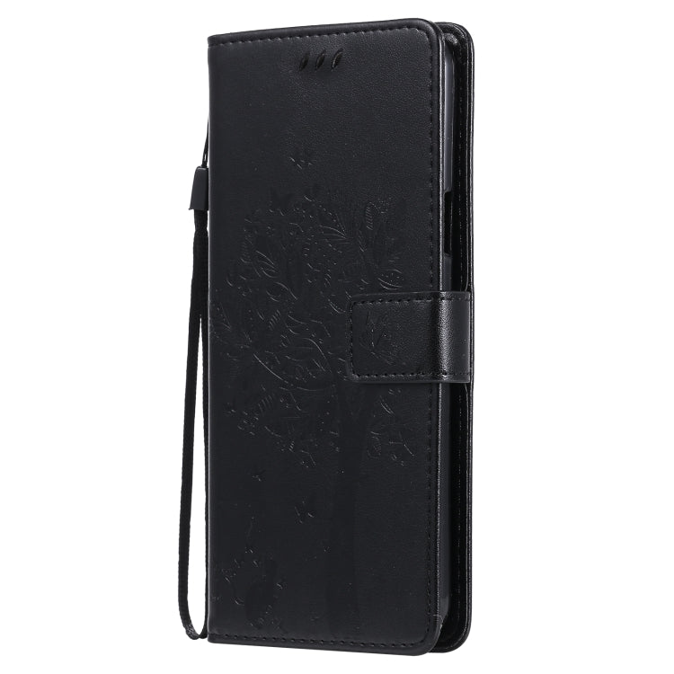 Funda Cuero PU LG K52 Árbol y Gato Patrón Impresión Prensada Horizontal con Soporte y Ranuras (Negro)