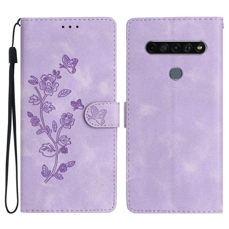 Funda de Cuero para LG K61 con Flor Mariposa y Relieve Patrón (Púrpura)