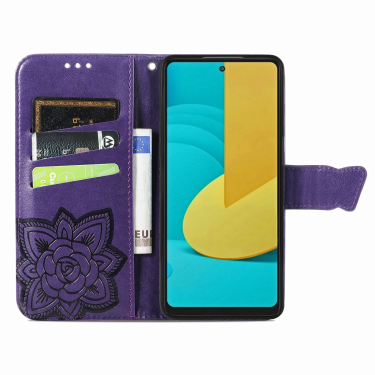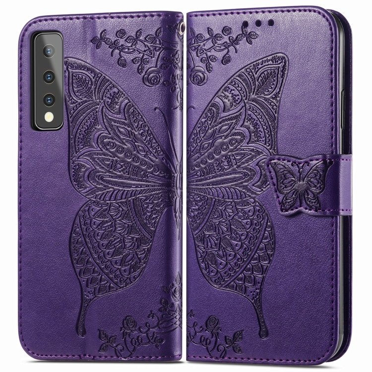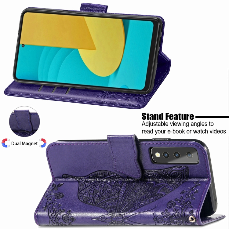 Funda de Cuero Horizontal para LG Stylo 7 Butterfly Love Flowe con Soporte, Tarjeta Slot, Wallet y Lanyard (Dark Purple)