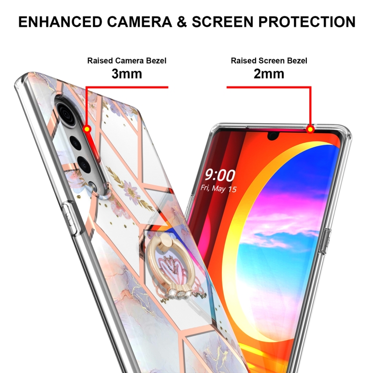 Funda TPU para LG Velvet Electroplating con Patrón de Flores Mármol y Soporte Anillo (Corona Imperial)