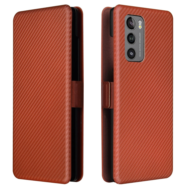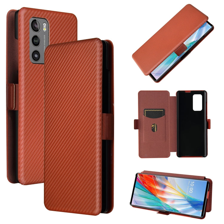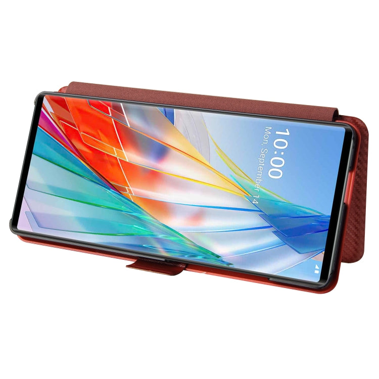 Funda para LG Wing 5G con Hebilla Textura Fibra de Carbono Flip Magnético TPU + PC Cuero PU Ranura Tarjeta (Marrón)