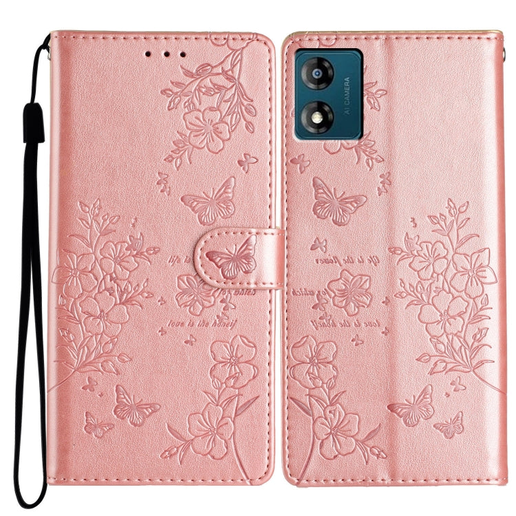 Funda de Cuero para Motorola Moto E13 con Mariposas y Flores (Oro Rosa)