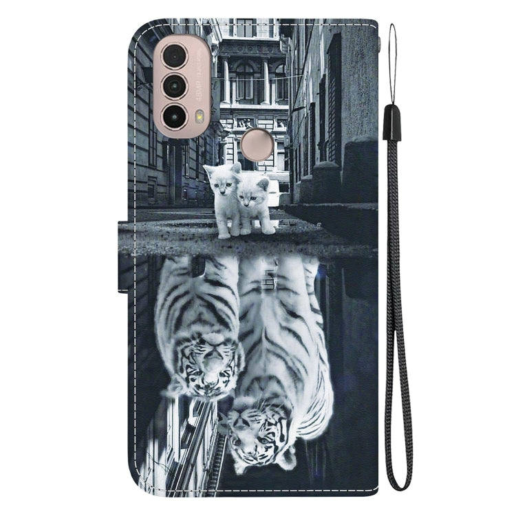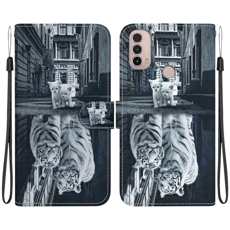 Funda de Cuero para Motorola Moto E20 E30 E40 con Dibujo Coloreado y Textura de Cristal (Reflejo de Tigre Gato)