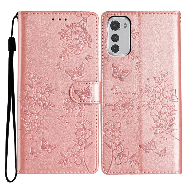Funda de Cuero para Motorola Moto E32 con Mariposas y Flores (Oro Rosa)