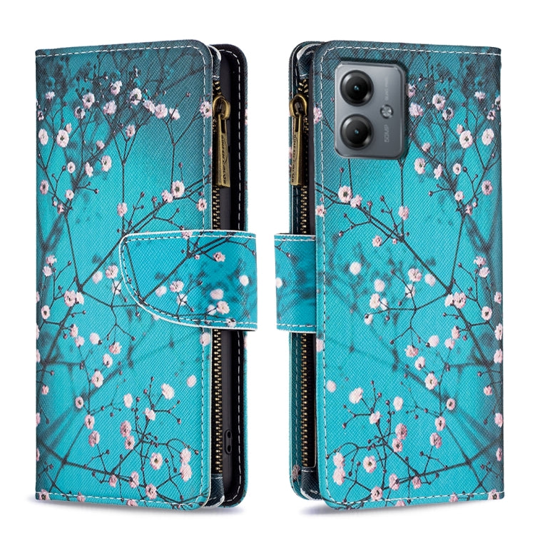 Funda de Cuero con Cremallera para Motorola Moto G14 4G con Dibujo Coloreado (Flor de Ciruelo)