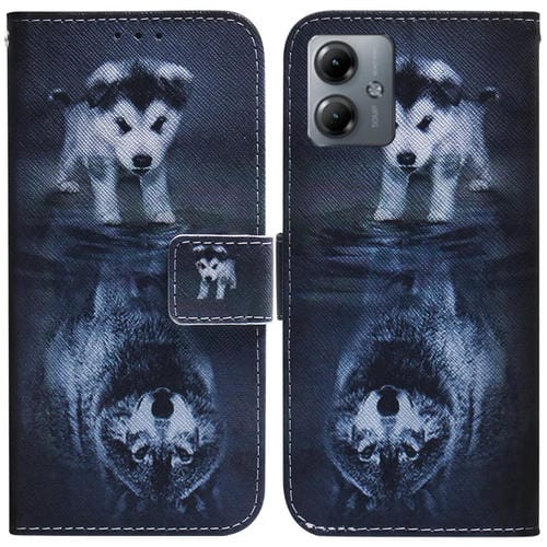 - 1x Funda de Cuero para Motorola Moto G14 con Tapa y Dibujo Coloreado (Lobo y Perro)
