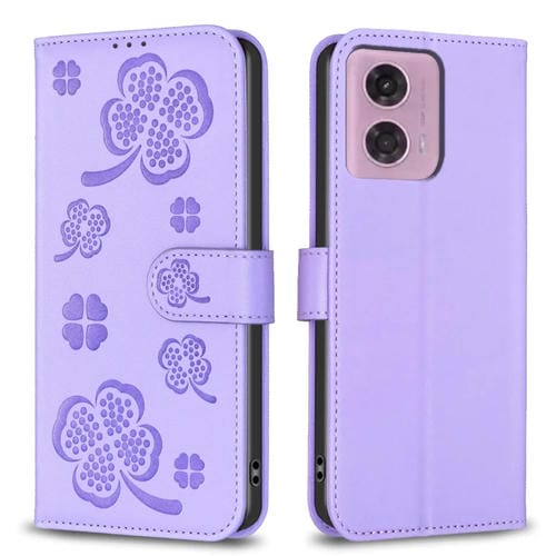 Funda de Cuero para Motorola Moto G24 con Relieve de Cuatro Hojas (Púrpura)