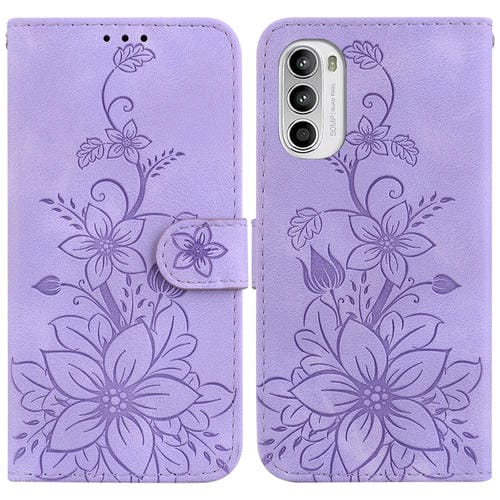 Funda de Cuero con Relieve Lily para Motorola Moto G52J Versión JP (Púrpura)