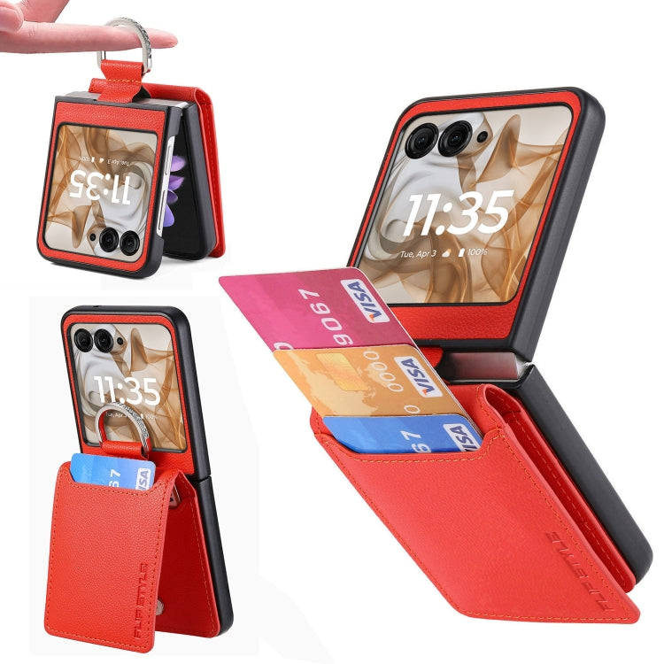 Funda para Motorola Razr 50 con Billetera y Anillo de Cuero Textura Litchi (Naranja)