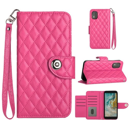 Funda para Nokia C02 de Cuero con Tapa, Textura Rómbica y Cordón (Rojo Rosa)