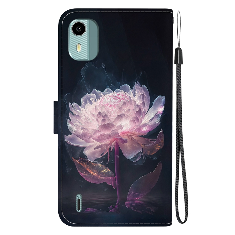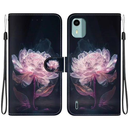 Estuche de Cuero para Nokia C12 con Dibujo Coloreado y Textura de Cristal (Peonía Púrpura)