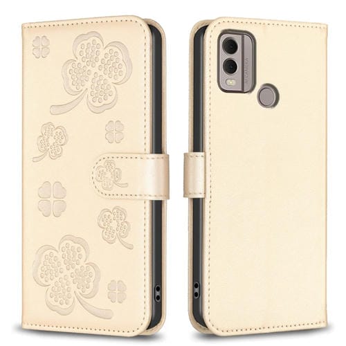 Funda de Cuero para Nokia C22 con Relieve de Cuatro Hojas (Dorado)