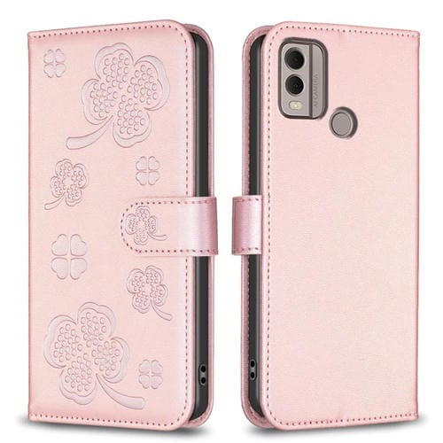 Funda de Cuero para Nokia C22 con Relieve de Cuatro Hojas (Rosa)