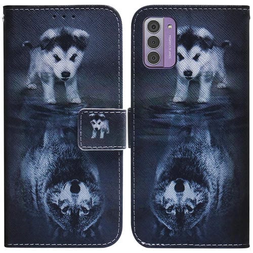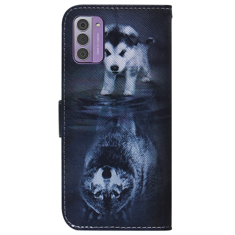 Funda de Cuero con Tapa para Nokia G42 con Dibujo Coloreado Lobo y Perro