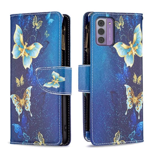 Estuche para Nokia G42/G310 de Cuero con Cremallera y Patrón Mariposa Dorada