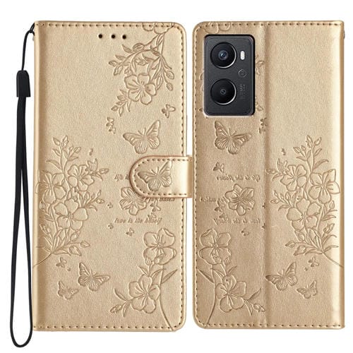 Para Oppo A36 / A76 / A96 Funda para Teléfono de Cuero con Relieve de Flor de Amor y Mariposa (Dorado)