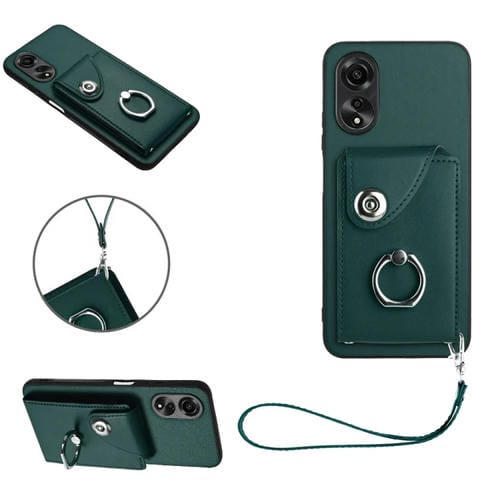 Para Oppo A38 4G / A18 4G Bolsa para Tarjeta de Órgano Global Soporte para Anillo Funda para Teléfono Pu con Cordón (Verde)