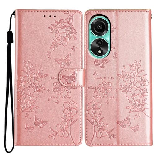 Para Oppo A58 4G Global Butterfly Love Flower Funda de Cuero para Teléfono En Relieve (Oro Rosa)