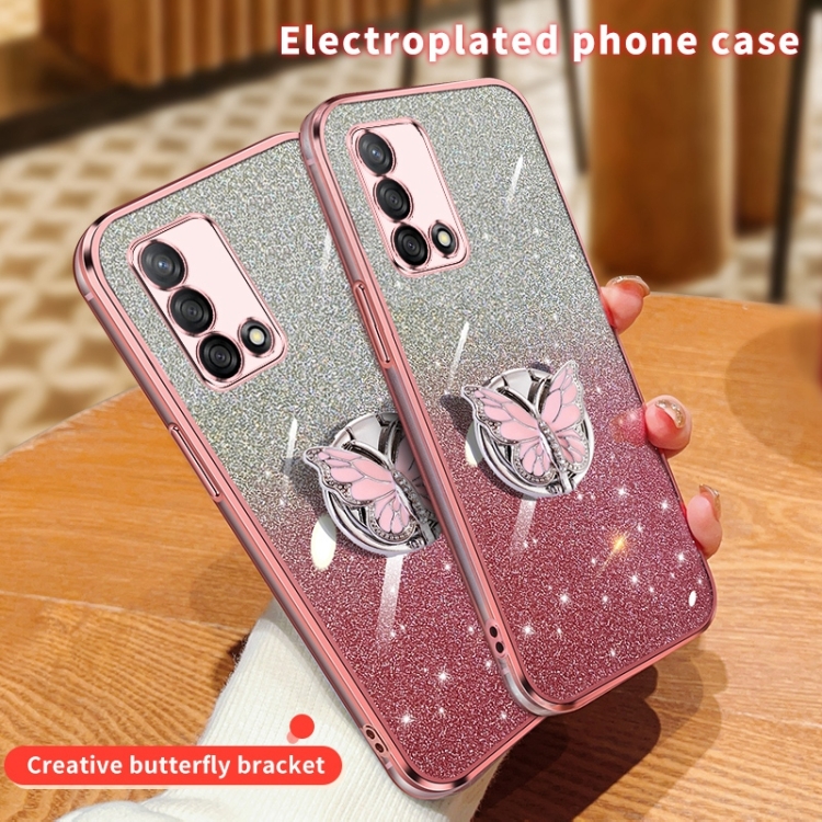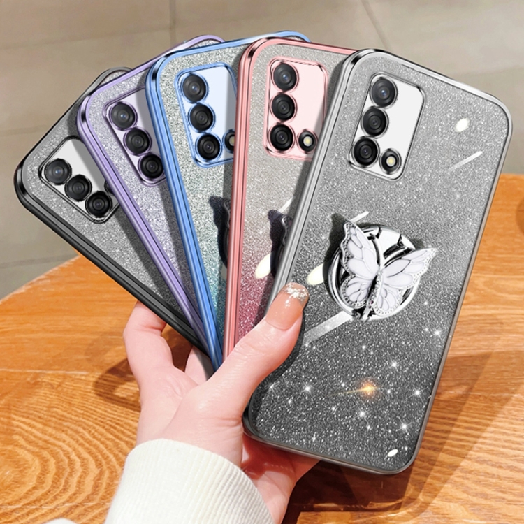 Para Oppo A74 Funda para Teléfono de TPU con Soporte de Mariposa con Brillo Degradado Plateado (Azul Sierra)