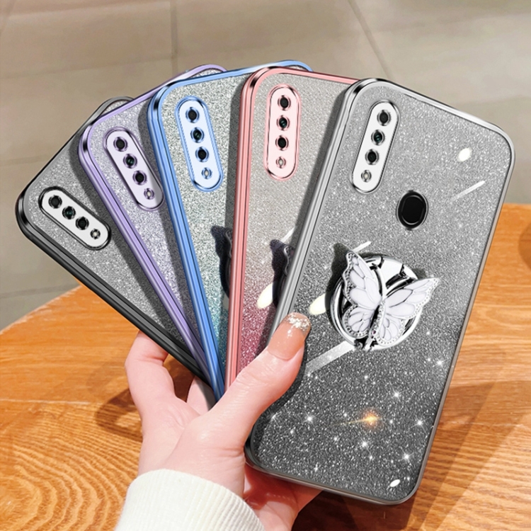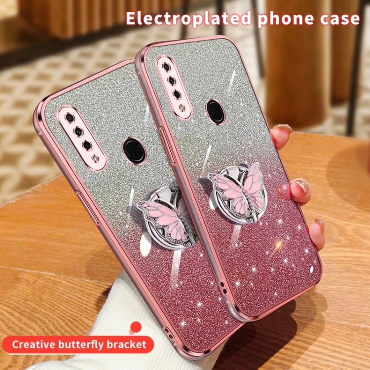 Para Oppo A8 Funda para Teléfono de TPU con Soporte de Mariposa con Brillo Degradado Plateado (Púrpura)
