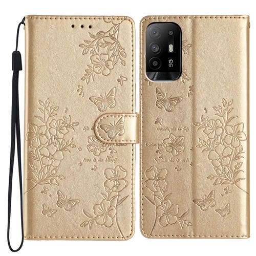 Para Oppo A94 5G Butterfly Love Flower Funda de Cuero para Teléfono En Relieve (Oro)