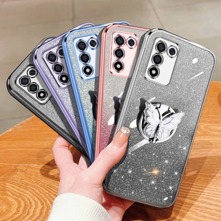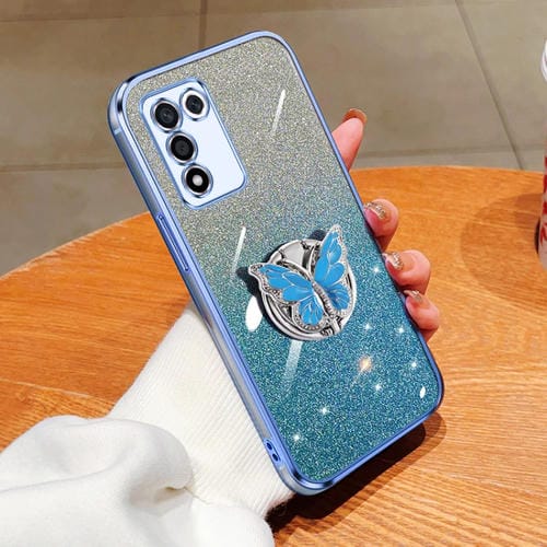 Para Oppo K9S Estuche para Teléfono de TPU con Soporte de Mariposa con Brillo Degradado Plateado (Azul Sierra)