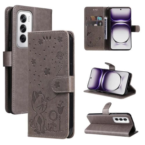 Para Oppo Reno12 5G Global Cat And Bee Funda de Cuero con Tapa En Relieve (Gris)