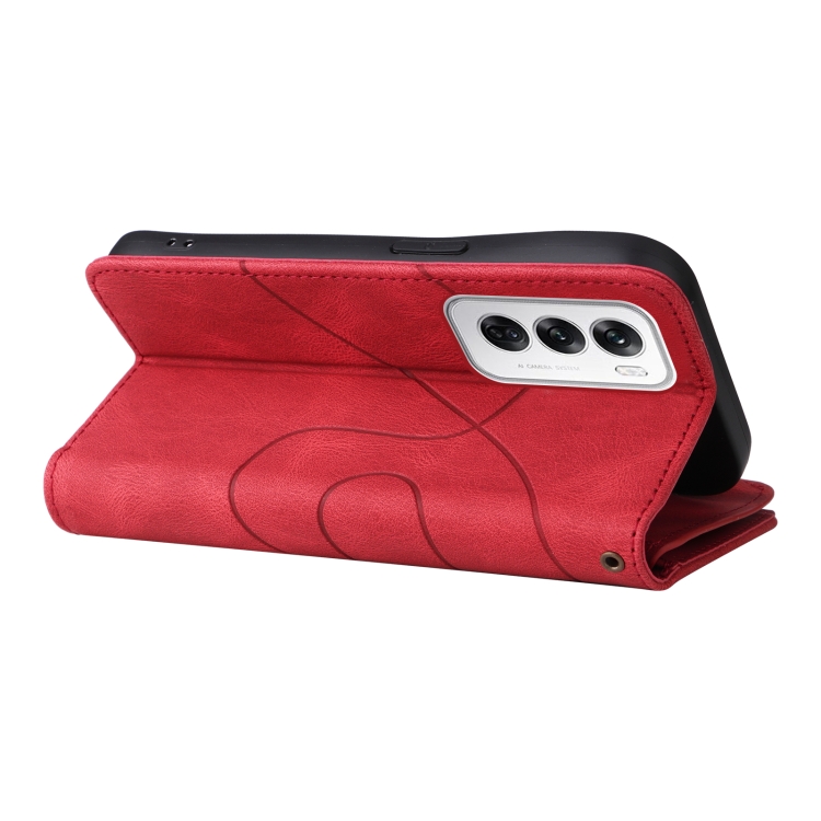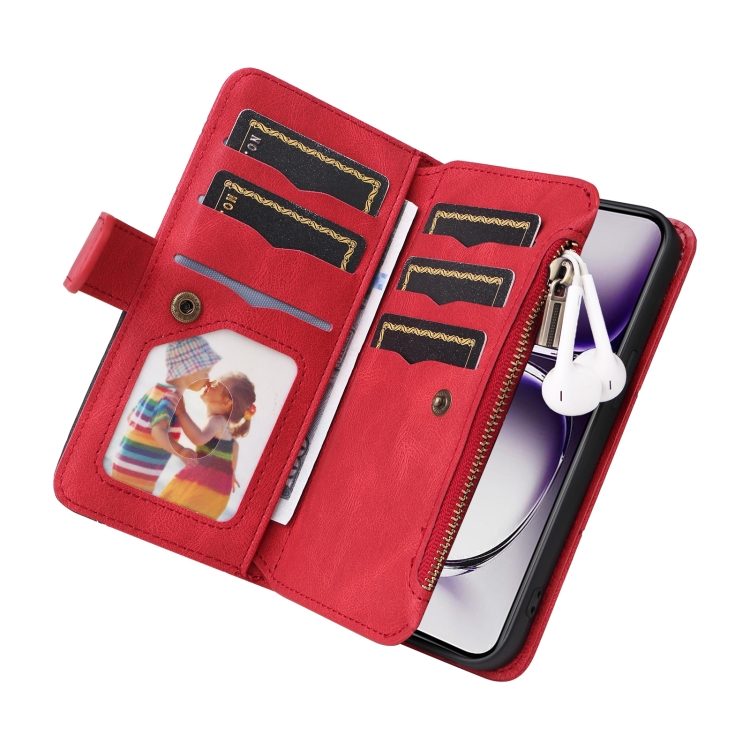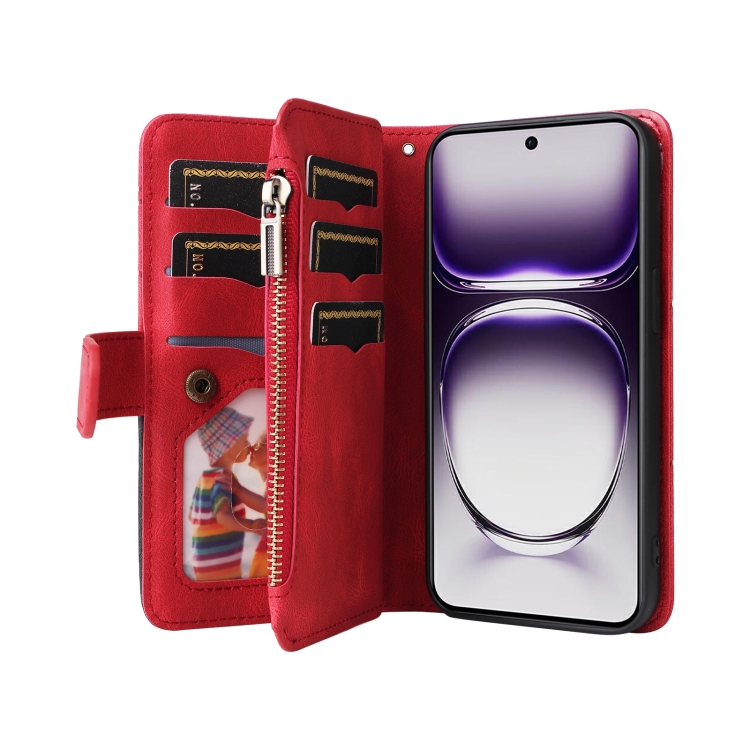 Para Oppo Reno12 5G Global Funda de Cuero para Teléfono con Billetera con Cremallera y 9 Ranuras para Tarjetas de Doble Color (Rojo)