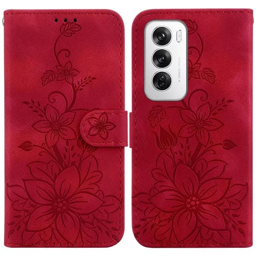 Para Oppo Reno12 5G Global Lily Funda de Cuero para Teléfono En Relieve (Rojo)