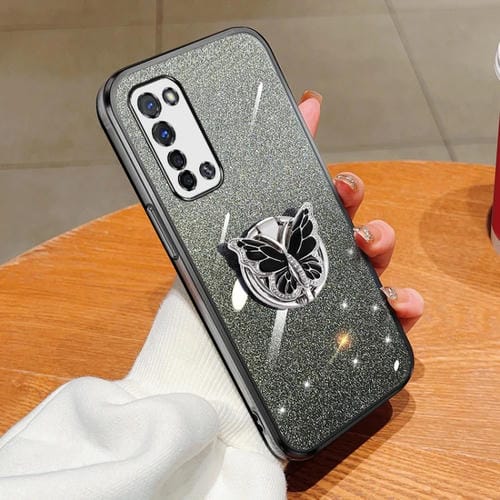 Para Oppo Reno3 Funda para Teléfono de TPU con Soporte de Mariposa con Brillo Degradado Plateado (Negro)