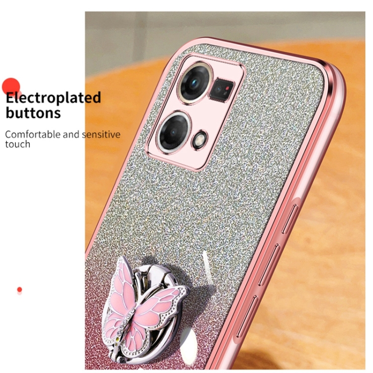 Para Oppo Reno7 4G Estuche para Teléfono de TPU con Soporte de Mariposa con Brillo Degradado Plateado (Púrpura)