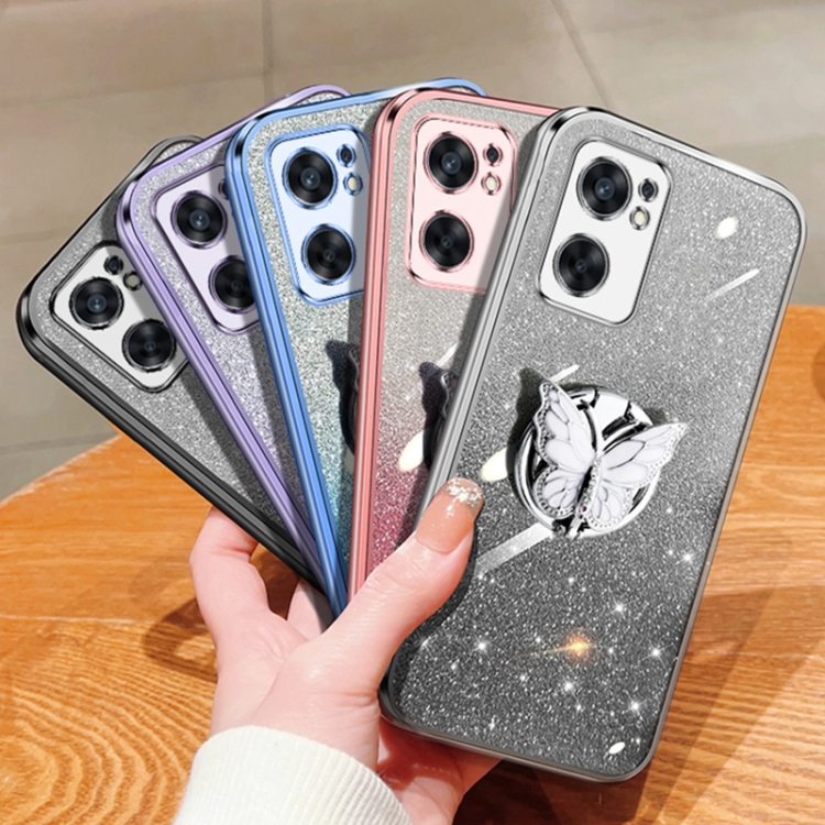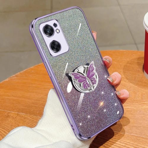 Para Oppo Reno7 Se Funda para Teléfono de TPU con Soporte de Mariposa con Brillo Degradado Plateado (Púrpura)