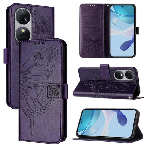 Funda de Cuero para Oukitel C38 con Mariposa en Relieve (Púrpura Oscuro)
