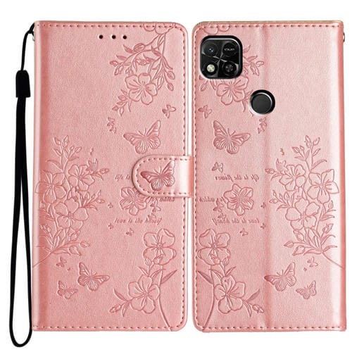 Para Redmi 9C Funda de Cuero para Teléfono con Mariposas y Flores (Oro Rosa)