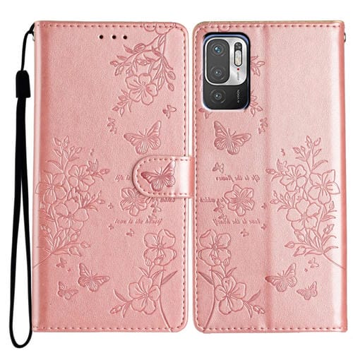 Para Redmi Note 10 5G Funda de Cuero para Teléfono con Mariposas y Flores (Oro Rosa)